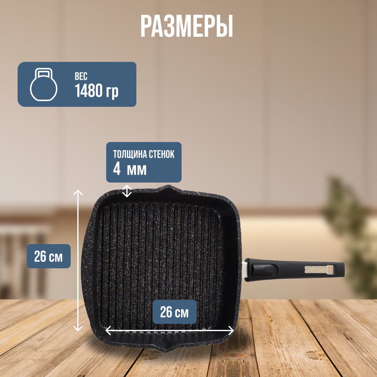 Сковорода-гриль мечта квадратн. 26*26см со съемн. ручкой, АП Гранит