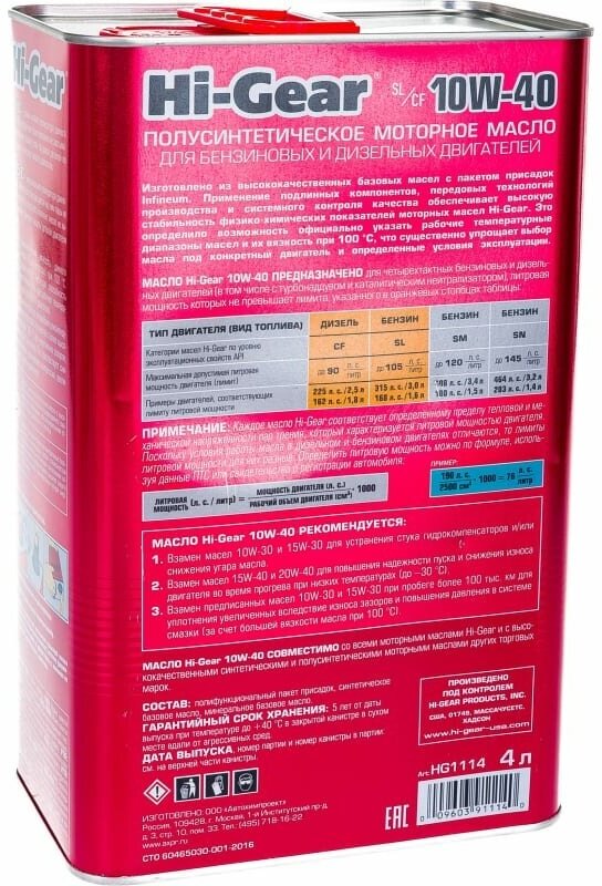 Полусинтетическое моторное масло Hi-Gear 10W40 SL/CF, 4л (арт. HG1114) HG1114