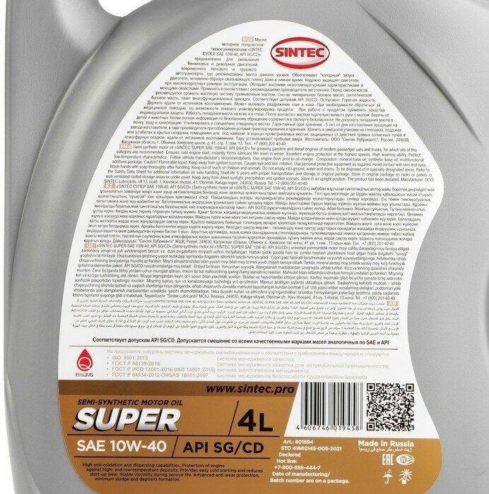 Масло моторное Sintec Super 10W-40, SG/CD, п/синтетическое, 801894, 4 л интересное: