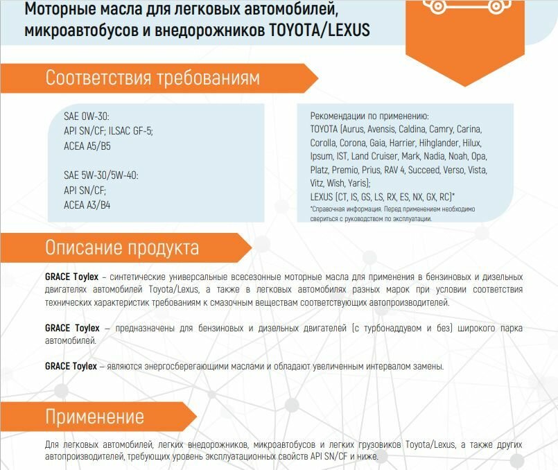 GRACE-OIL 4603728818535 Масло моторное для TOYOTA LEXUS Toylex 5W30 синт.1л GRACE интересное: