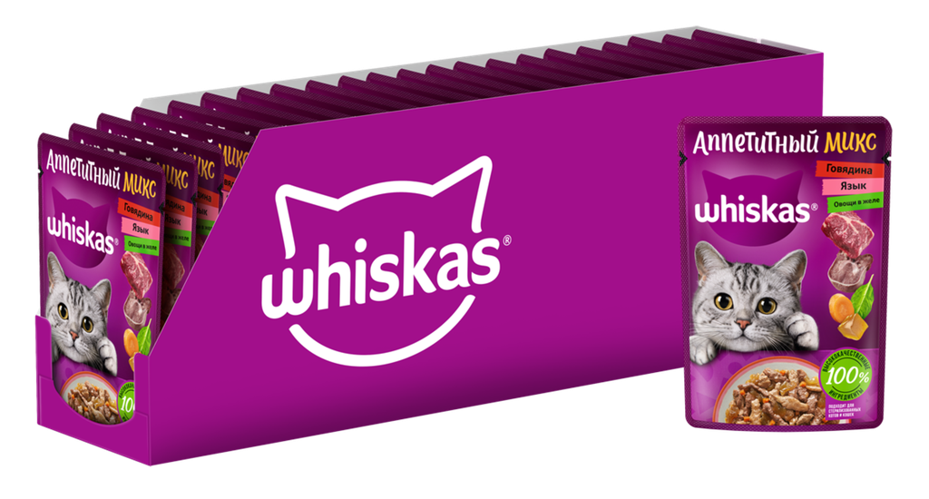 Влажный корм WHISKAS «Аппетитный микс» для кошек с говядиной, языком и овощами в желе, 75г*28шт