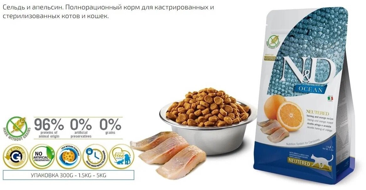 Сухой корм Farmina N&D Ocean для стерелизованных кошек и кастрированных котов всех пород, Фармина НД беззерновой рацион со вкусом сельди и апельсина, 1,5кг