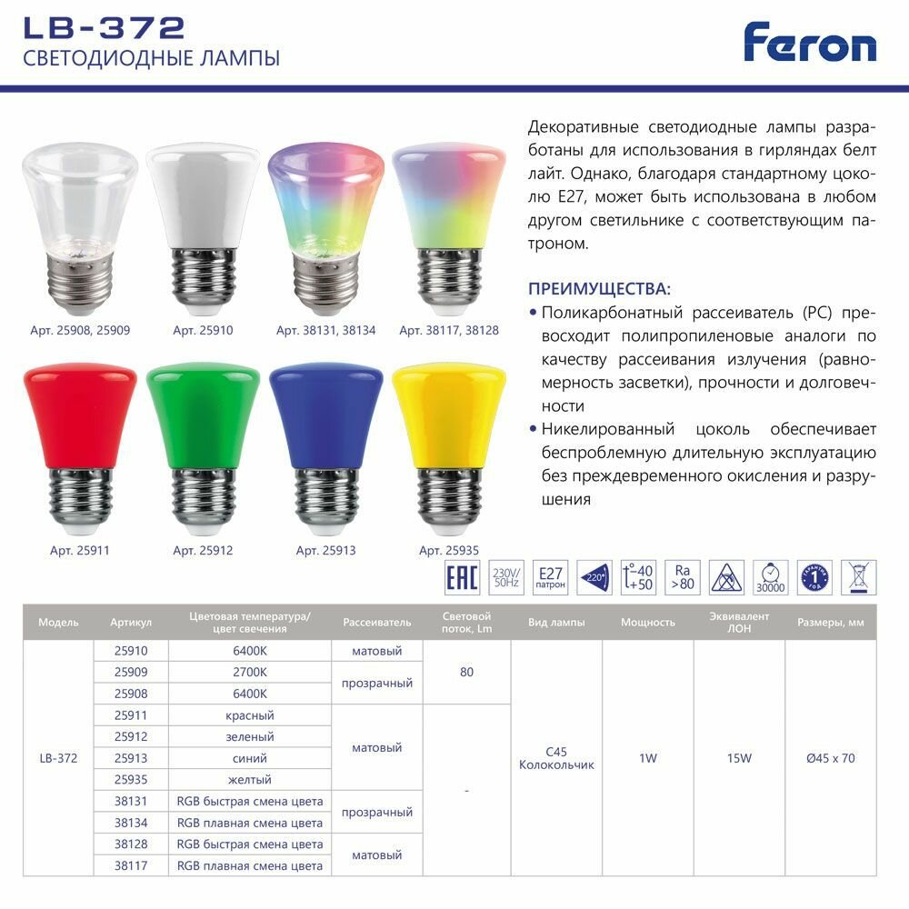 Лампа светодиодная FERON LB-372 арт. 25913, C45 (колокольчик) 1W E27 (синий) 230V