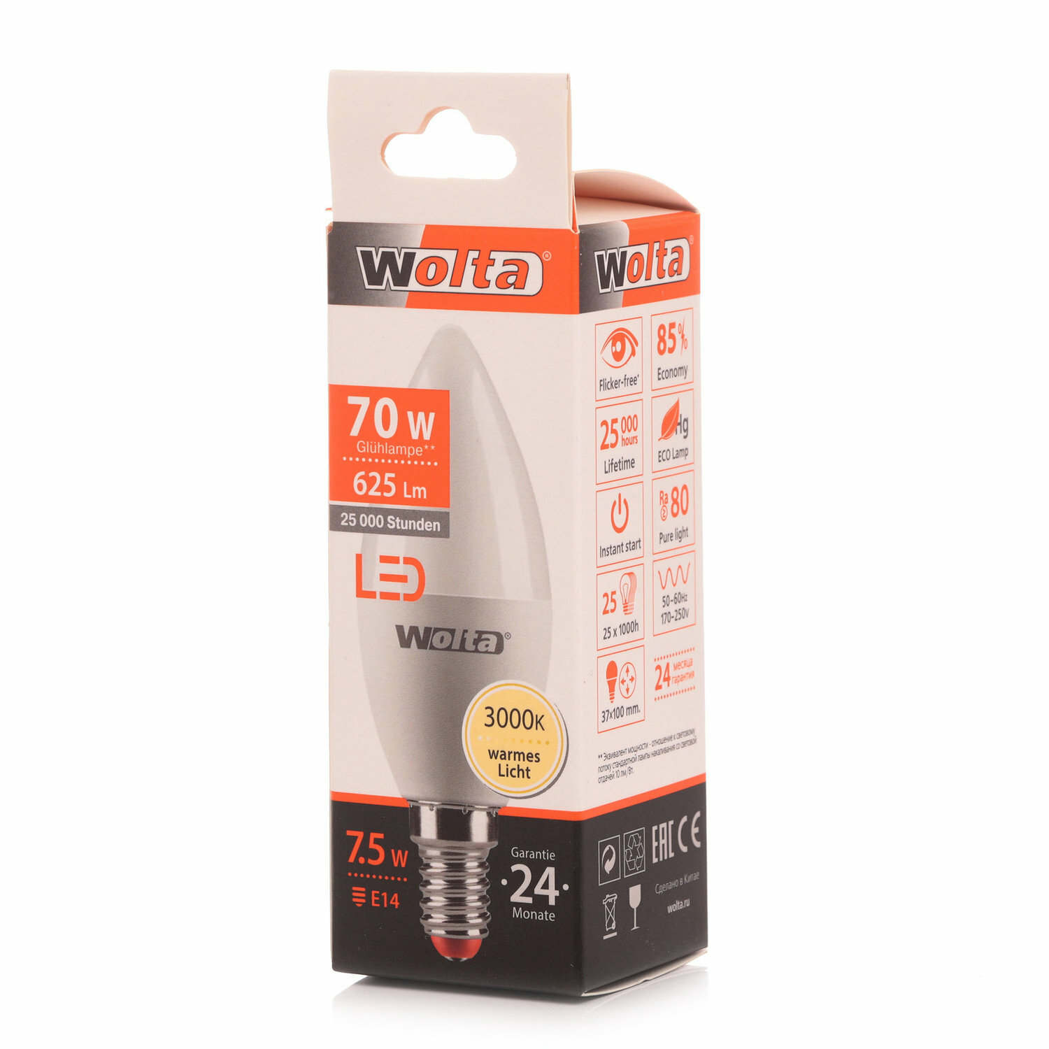 Wolta лампа светодиодн. свеча C37 E14 7,5W(625Lm) 3000K 2K 100X37 25YC7.5E14 (арт. 681443)