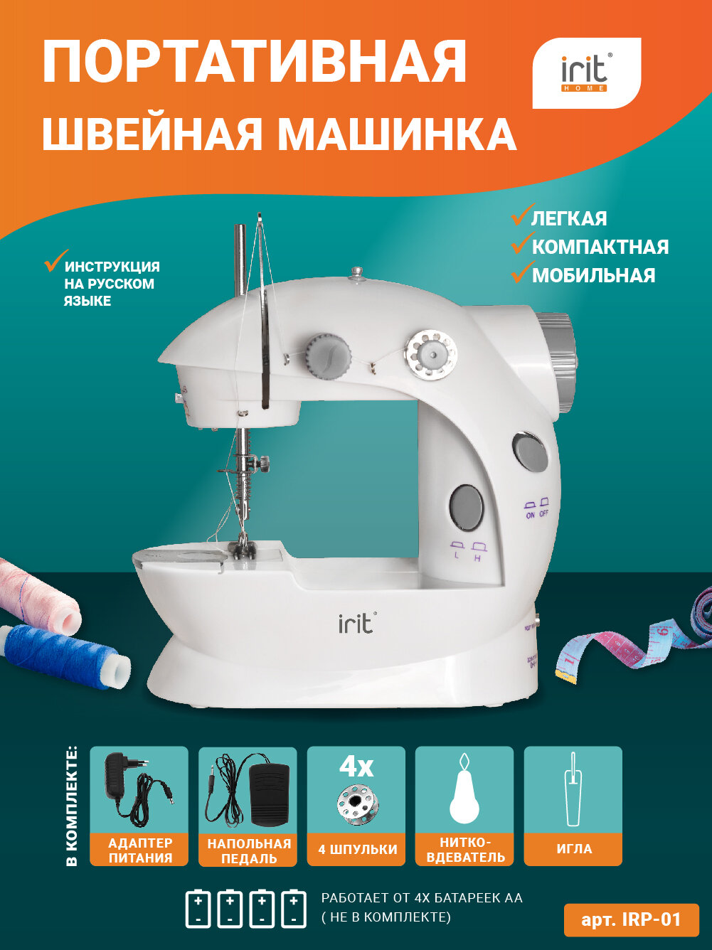Швейная машина Irit IRP-01, 19 Вт, полуавтомат, от батареек/сети, бело-серая