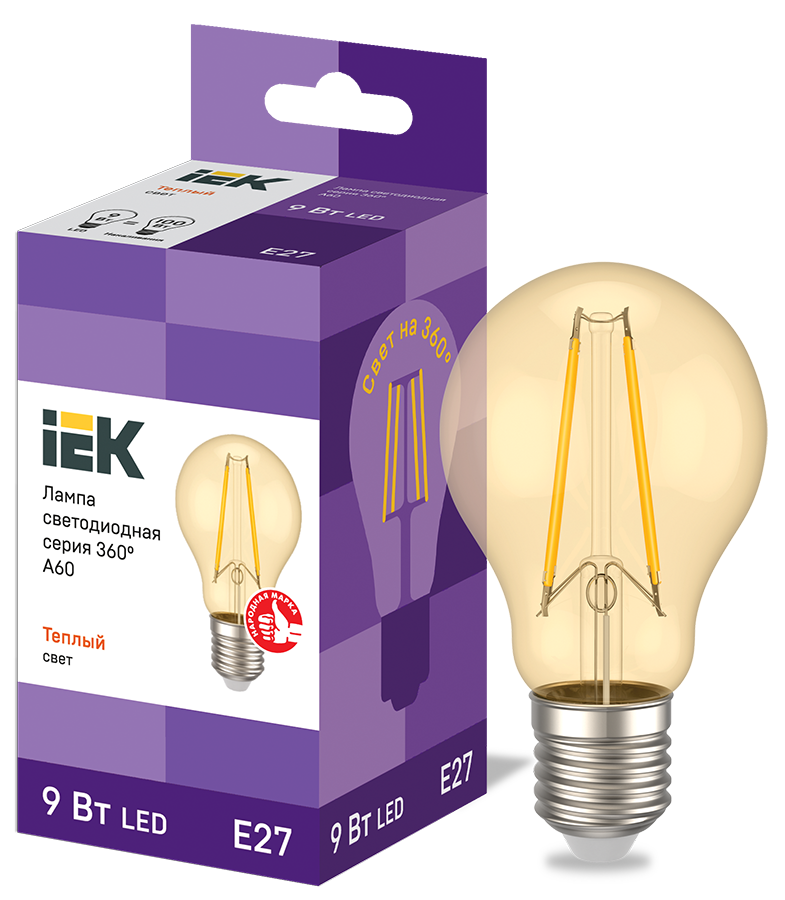 Лампа светодиодная LED 9вт Е27 теплый FILAMENT | код LLF-A60-9-230-30-E27-CL | IEK (1 шт.)