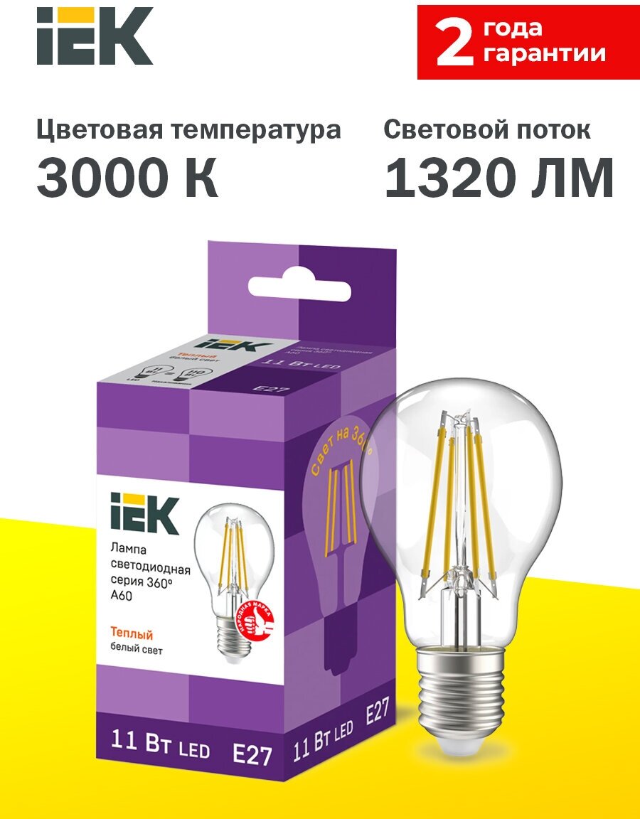 Лампа светодиодная A60 шар прозр. 11Вт 230В 3000К E27 серия 360° IEK LLF-A60-11-230-30-E27-CL (1 шт.)