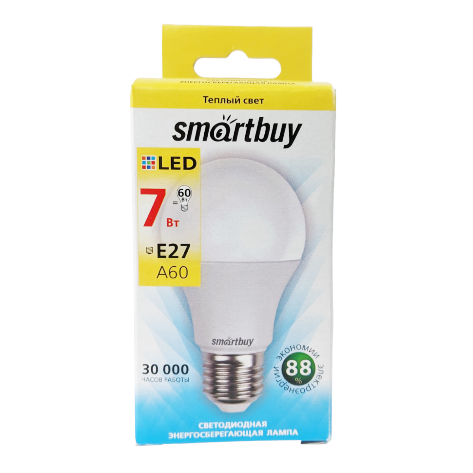 Лампа cветодиодная Smartbuy, A60, E27, 7 Вт, 3000 К, теплый белый