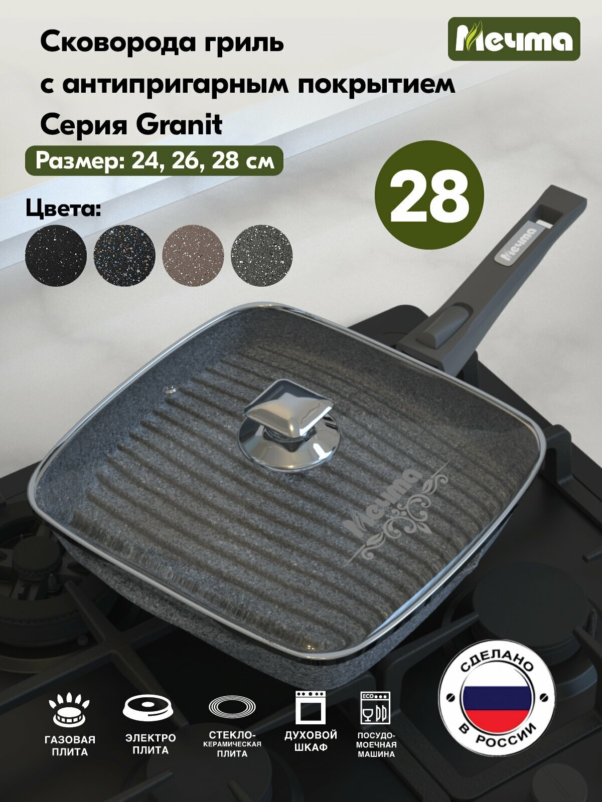 Сковорода гриль Мечта квадратная 28х28 см Гранит с антипригарным покрытием со съемной ручкой и крышкой, НЕ индукционная