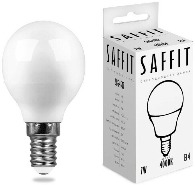 Лампа светодиодная SAFFIT SBG4507 арт. 55035, G45 (шар) 7W E14 4000К (белый) 230V