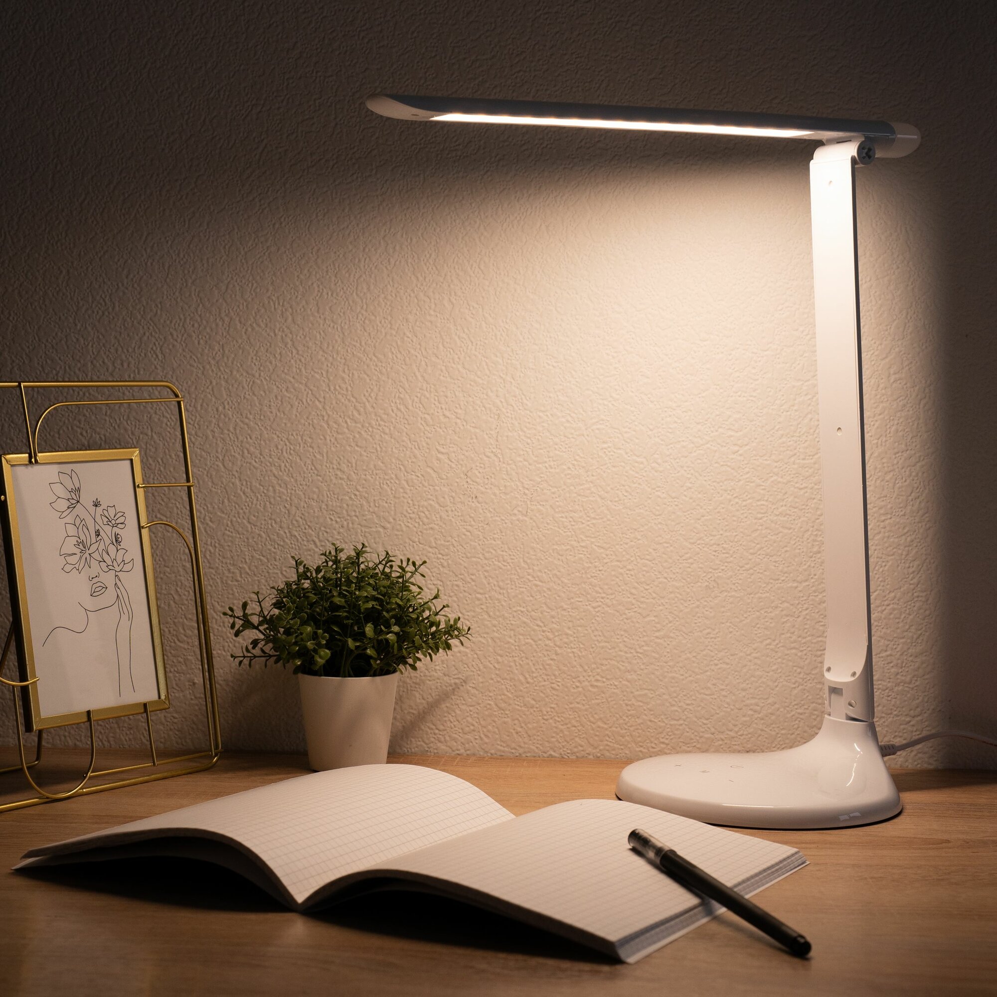 Прям сделана с умом. Есть несколько режимов света, что позволяет иметь всегда нужную яркость Можно использовать как ночник, но ярковатый. Удобно размещается на столе. За свои деньги очень достойно сделаный продукт |
