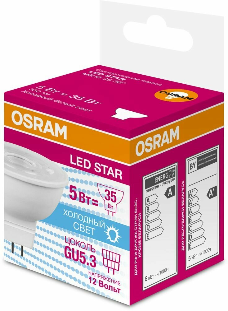 Лампа OSRAM LED Star GU5.3 MR16 12В 5Вт, светодиодная LED, 350 лм, эквивалент 35Вт, нейтральный свет 4000К, прозрачная