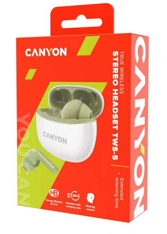 Ниже Вы можете прочитать отзывы на Наушники Canyon TWS-5, вакуумные, микрофон, сенсор, BT 5.3, 40/500 мАч, IP33, зеленые, ознакомится с подробными характеристиками, посмотреть интересные обзоры и фотографии на Наушники Canyon TWS-5, вакуумные, микрофон, сенсор, BT 5.3, 40/500 мАч, IP33, зеленые.