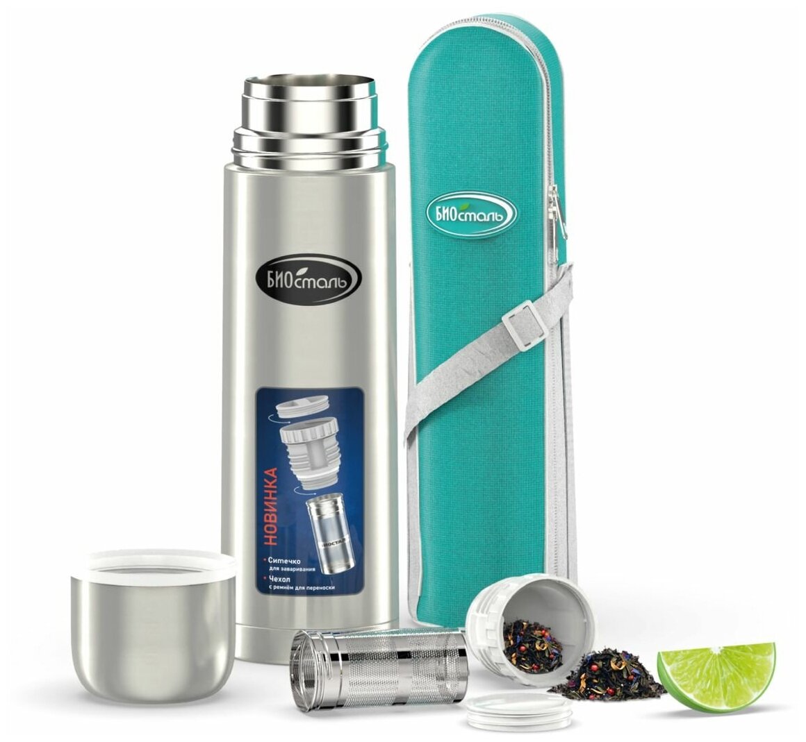 Термос Biostal (1 литр), с ситечком и чехлом, стальной