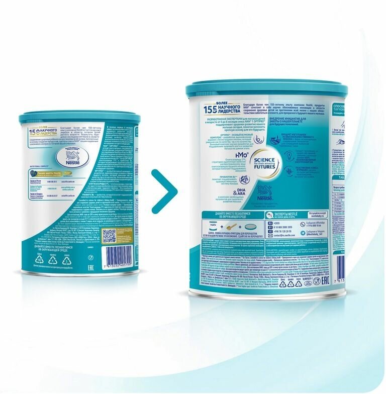 | Дополнительная информация | упаковано в модифицированной атмосфере с азотом; рекомендации по приготовлению: прежде чем приступить к приготовлению смеси, вымойте руки; тщательно вымойте бутылочку, соску и крышку, чтобы в них не осталось следов молока; прокипятите их в течение 5 минут; накройте до использования; прокипятите питьевую воду в течение 5 минут и затем остудите до 37°С; руководствуясь таблицей кормления, налейте в прокипяченную бутылочку точно отмеренное количество теплой воды; используйте только мерную ложку, находящуюся в банке, заполненную без горки; руководствуясь таблицей кормления, добавьте точное количество мерных ложек сухого порошка в соответствии с возрастом ребенка; после использования положите мерную ложку на выступ в банке, как показано в инструкции; взболтайте бутылочку до полного растворения порошка; после приготовления смеси банку с порошком следует плотно закрыть и хранить в сухом прохладном месте; условия хранения: до и после вскрытия хранить при температуре не выше 25 °С и относительной влажности воздуха не более 75%, содержимое банки должно быть использовано в течение 3 недель после вскрытия, не рекомендуется хранить в холодильнике |