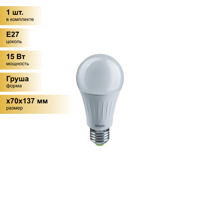 (10 шт.) Светодиодная лампочка Navigator ЛОН А70 E27 15W(1275lm) 6500 6K 70х135 NLL-A70-15-230-6.5K-E27 61239 . Цоколь E27
