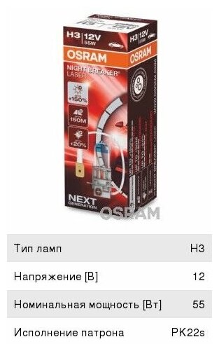 Osram1 OSRAM Лампа H3 12V 55W NIGTT BRAKER LASER +150% PK22s, карт.1 шт. OSRAM 64151NL