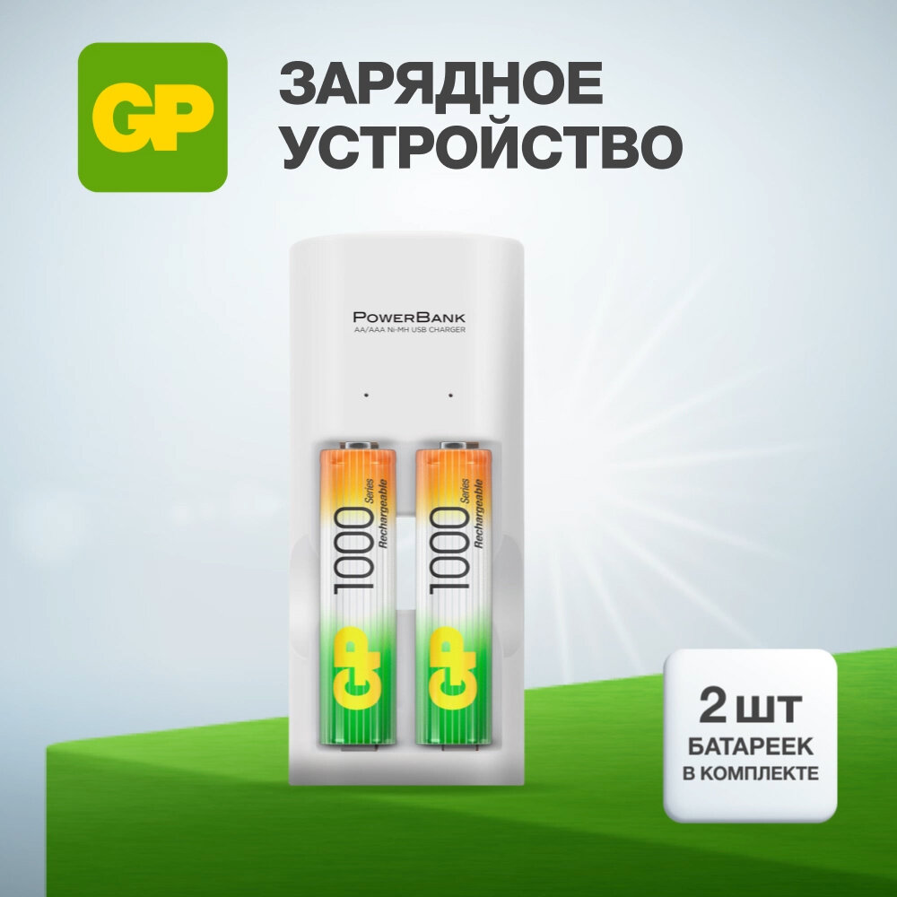 Зарядное устройство GP для аккумуляторных батареек АА и ААА на 2 слота, с аккумуляторами AA 1000 mAh, набор 2 шт, с кабелем micro USB