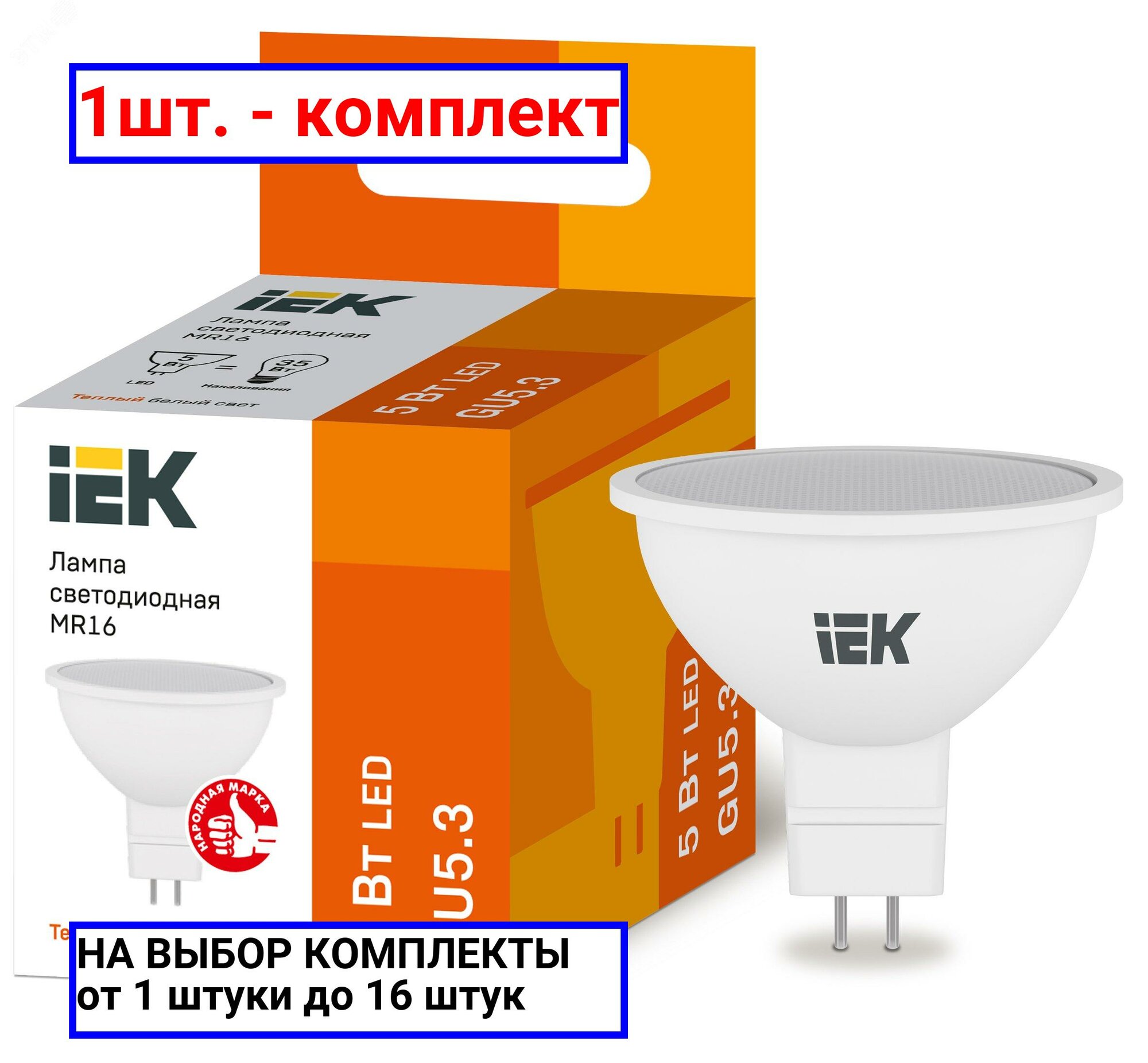 (15 шт.) Светодиодная лампочка IEK MR16 GU5.3 220V 5W(450lm) 3000K 2K 50x50 матов. ECO LLE-MR16-5-230-30-GU5 . Цоколь GU5.3