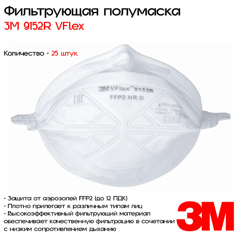 Купить 3М Полумаска противоаэрозольная фильтрующая VFlex 2 класс защиты FFP2 NR D 25 шт./уп. 9152R РОЗ 7100
