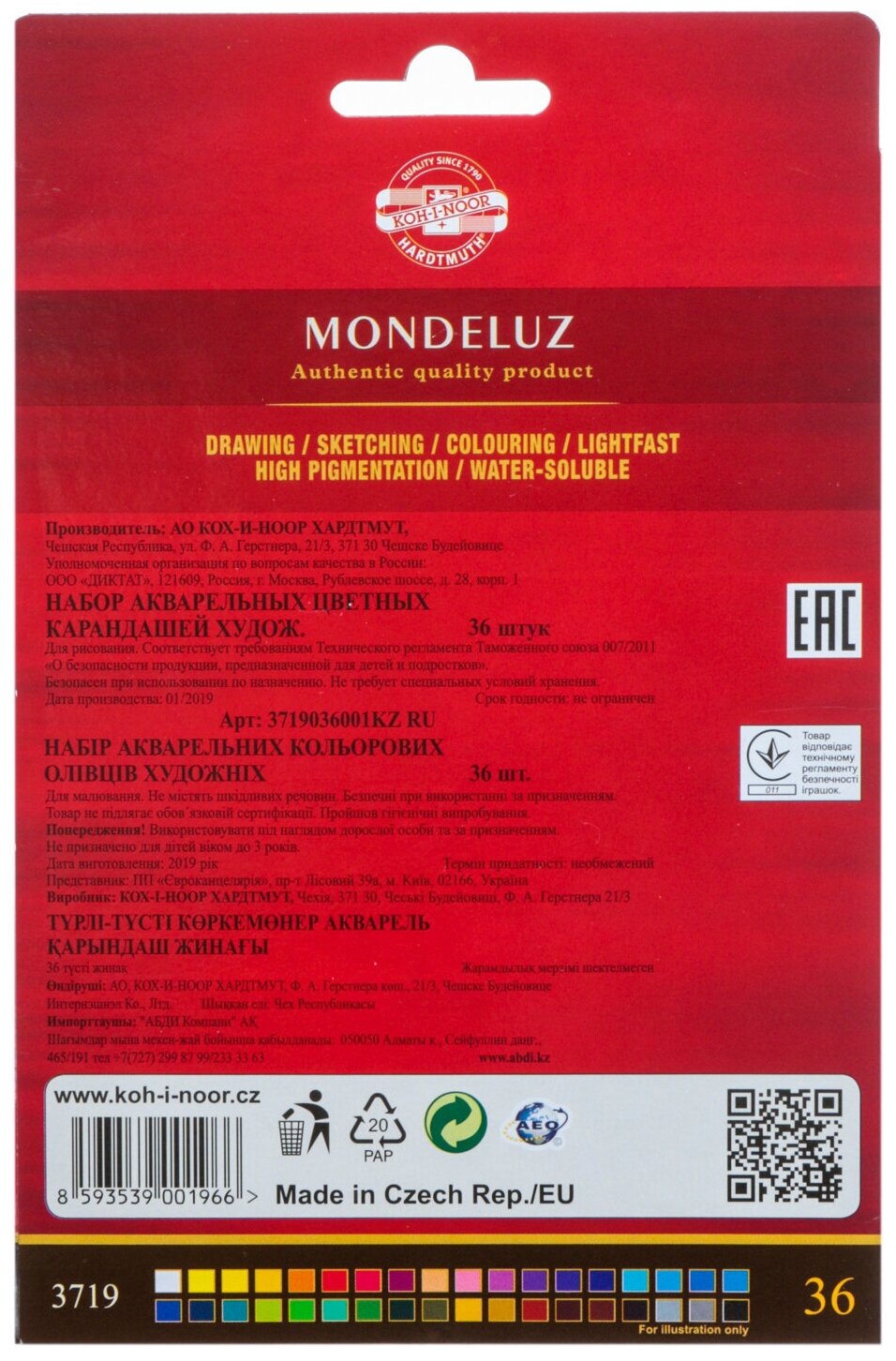 Карандаши цветные акварельные художественные KOH-I-NOOR "Mondeluz", 36 цветов, 3.8 мм, заточенные, европодвес, 3719036001KZRU