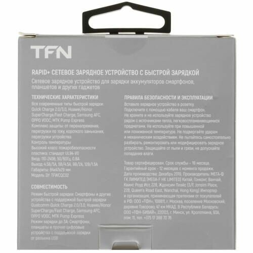 Сетевое зарядное устройство TFN RAPID + 22.5ВТ, 5A, USB, быстрая зарядка (TFN-WCRPD01) черный