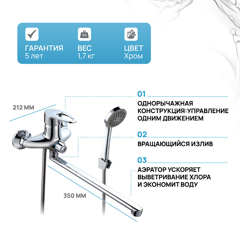 Смеситель для ванны, РМС SL52-006E-3, с лейкой и шлангом, длинный излив.