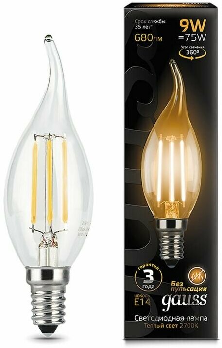 Лампа светодиодная LED свеча филамент 9W E14 680Лм 2700К 220V Filament (Gauss), арт. 103801109