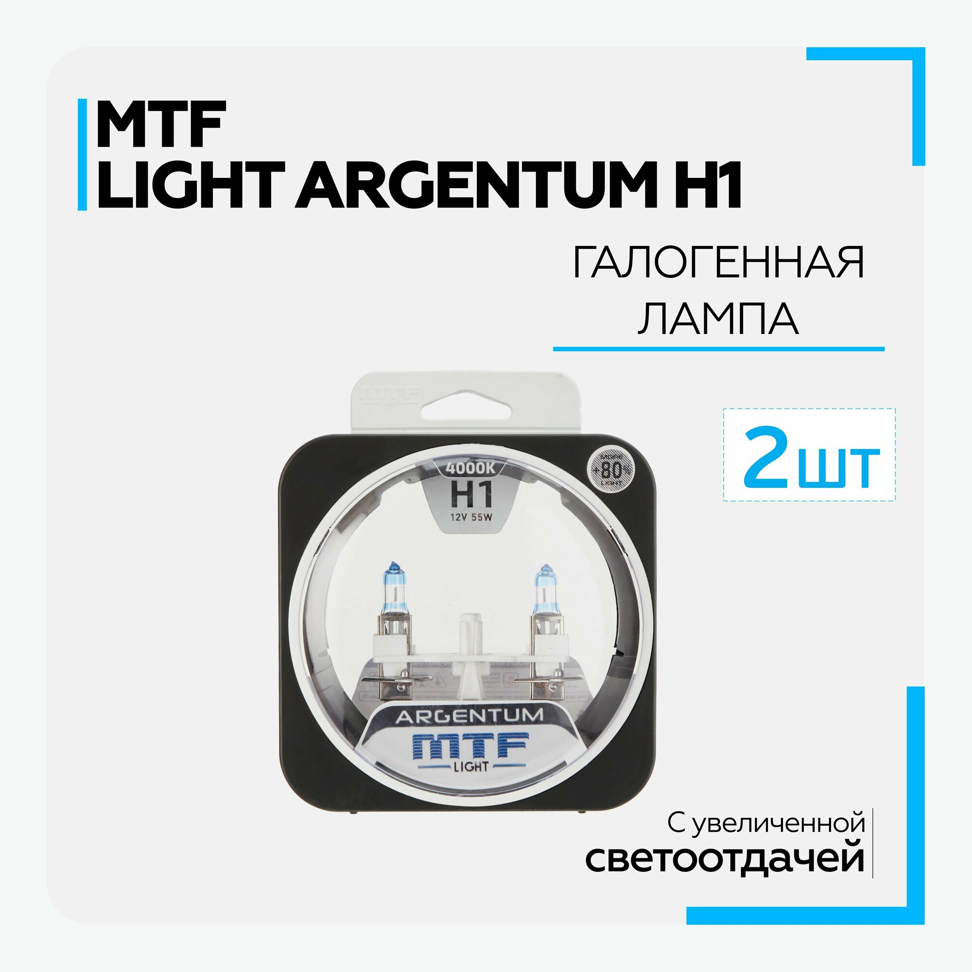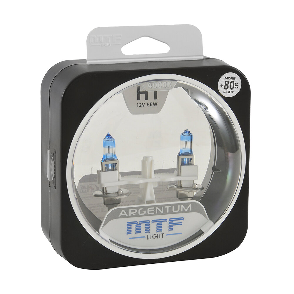 Галогенные автолампы MTF Light серия ARGENTUM +80% H1, 12V, 55W, комплект 2 лампы