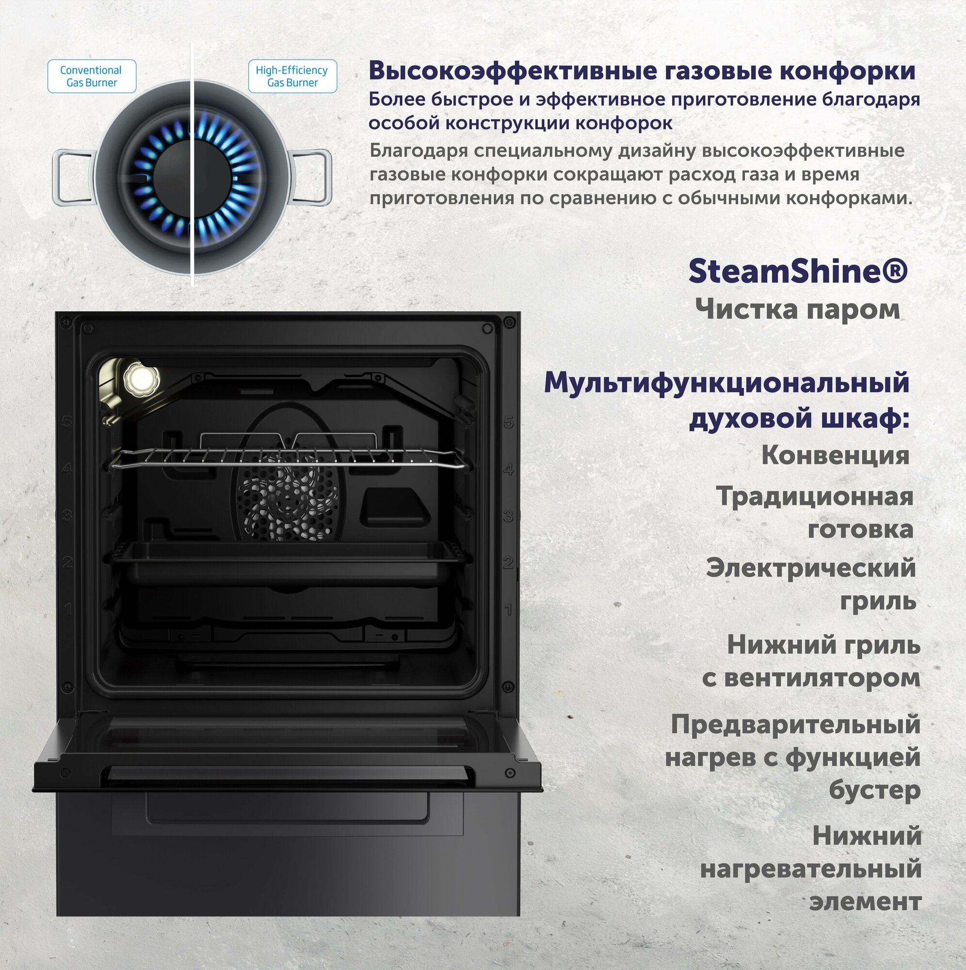 | Особенности конструкции | эмаль легкой чистки / ящик для посуды / подсветка духовки / воздушное охлаждение корпуса |