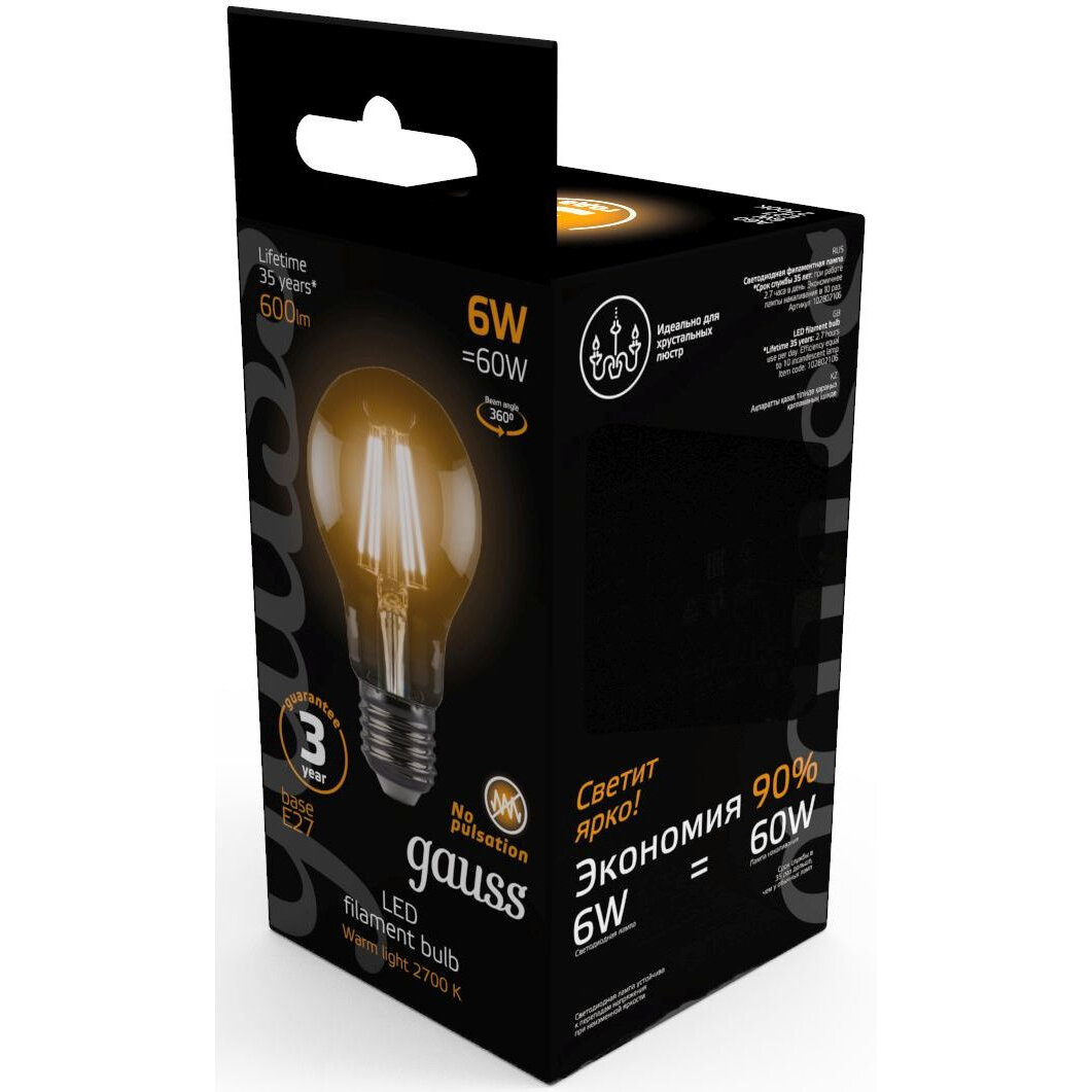 (1 шт.) Светодиодная лампочка Gauss A60 6Вт 150-265В 2700К E27 филамент.