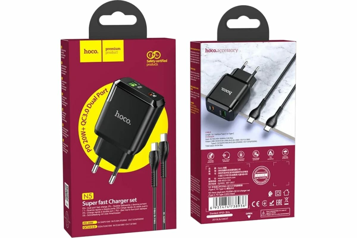 Сетевое зарядное устройство, 1 USB 3.0 QC+1 PD 20W (N5), HOCO, Type-C to Type-C, черный