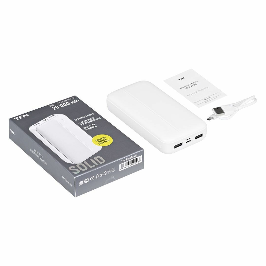 АКБ внешний TFN-PB-282-WH Solid 20 белый (2in USB-A / 20000mAh) Белый