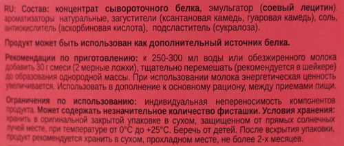| Дополнительная информация | рекомендации по применению: к 250-300 мл воды или обезжиренного молока добавить 30 г смеси (2 мерные ложки), тщательно перемешать (рекомендуется в шейкере) до образования однородной массы. При использовании молока энергетическая ценность увеличивается. Использовать в дополнение к основному рациону, между приемами пищи.; размер порции в г(мл): 30; состав: концентрат сывороточного белка, эмульгатор (соевый лецитин), ароматизаторы натуральные, загустители (ксантановая камедь, гуаровая камедь), соль, антиокислитель (аскорбиновая кислота), подсластитель (сукралоза) |