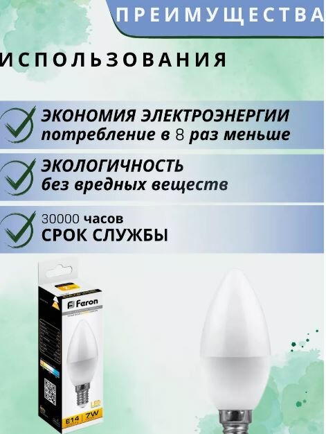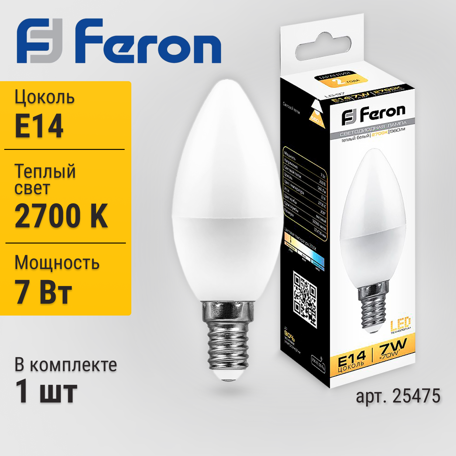 Лампа светодиодная FERON, С37, 7 Вт, Е14, 2700 К, теплый белый