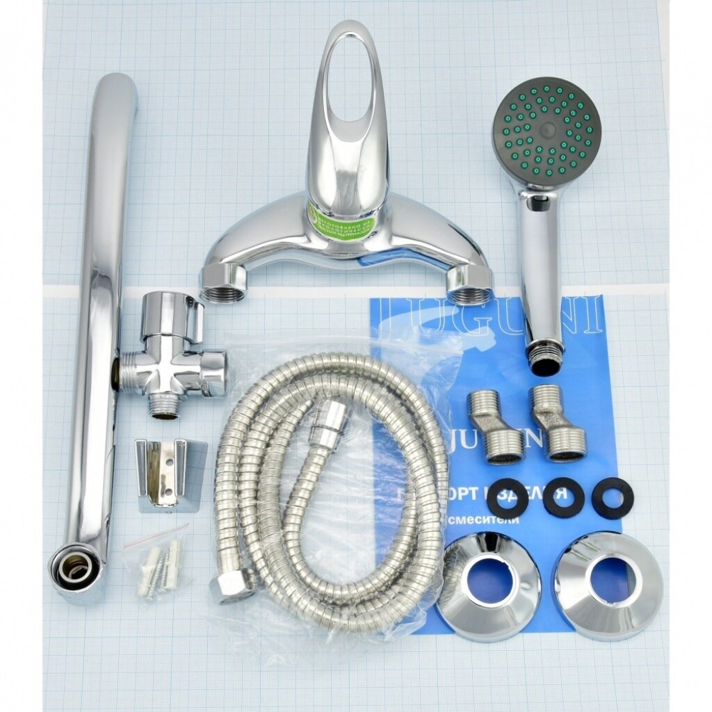 Ванно-душевой смеситель Juguni одноручный, с металлическим шлангом и хромированной лейкой 0402.609A