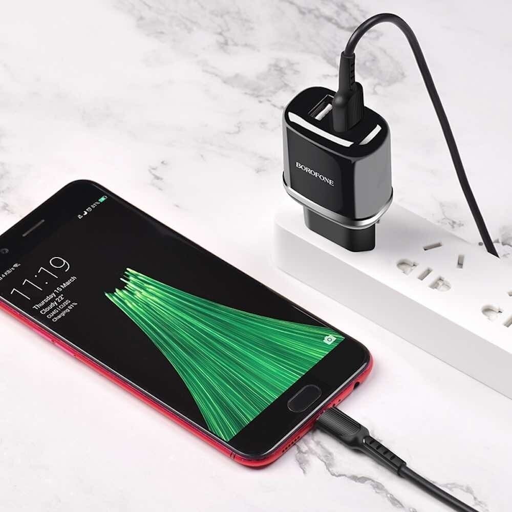 Сетевое зарядное устройство Borofone BA25A Outstanding 2xUSB-А, 2.4 А + кабель Lightning 8-pin, 1 м, черный