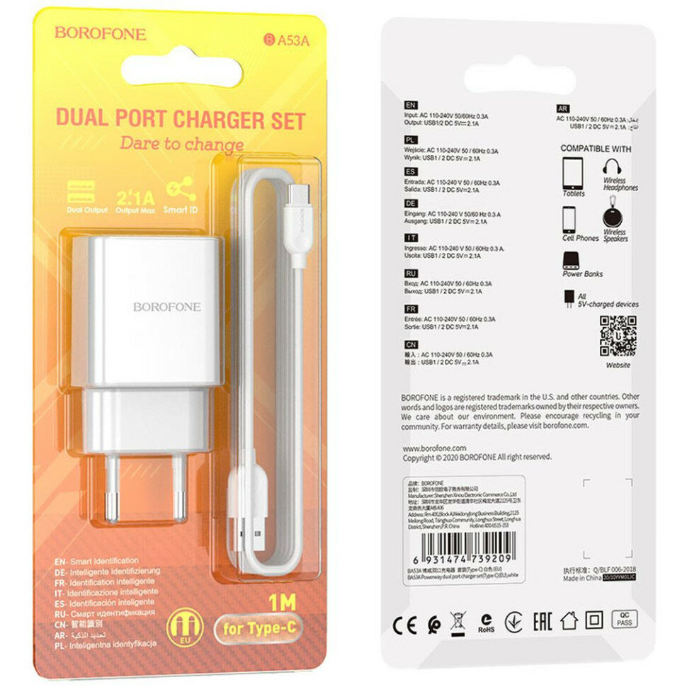 Купить Сетевое зарядное устройство Borofone BA53A, 2xUSB, 2.1 А, кабель Type-C, белое