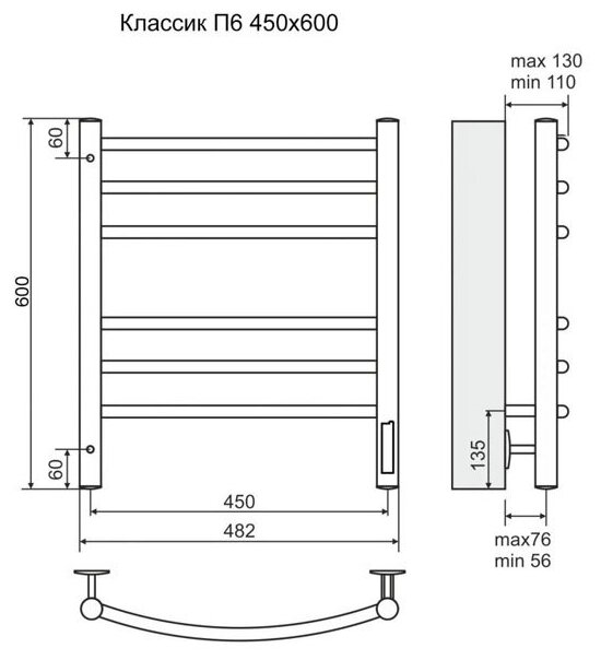 Полотенцесушитель TERMINUS Классик П6 (ШВ:450х600) электро, КС 9005 матовый, диммер встроен, правый