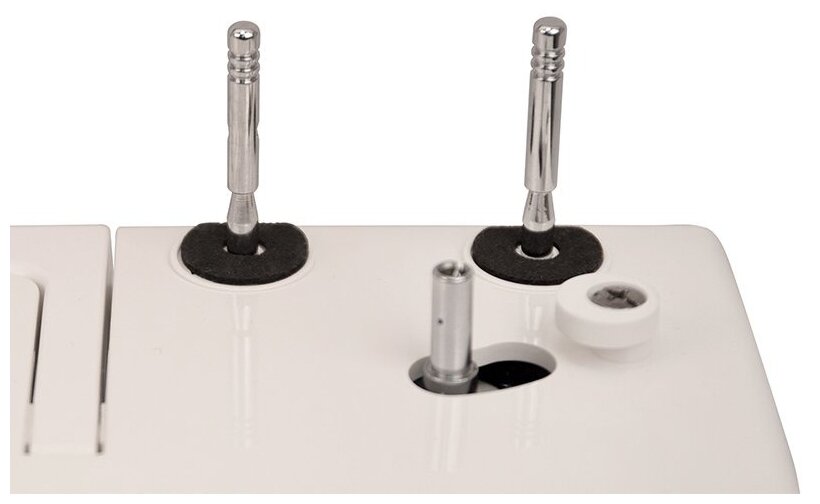 | Плюсы: | Комплектность, есть все основные строчки, хороший функциональный и вместительный пенал, железные штыри под катушки, вертикальный челнок, вес, жёсткий чехол. |