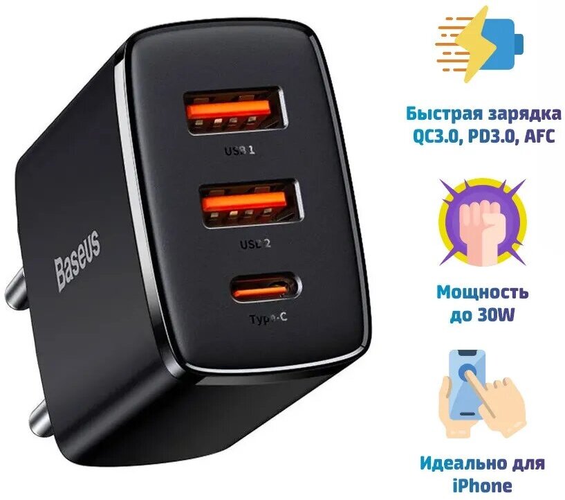 Зарядное устройство Baseus Compact Quick Charger 2*USB+USB-C, 3A, 30W, черный