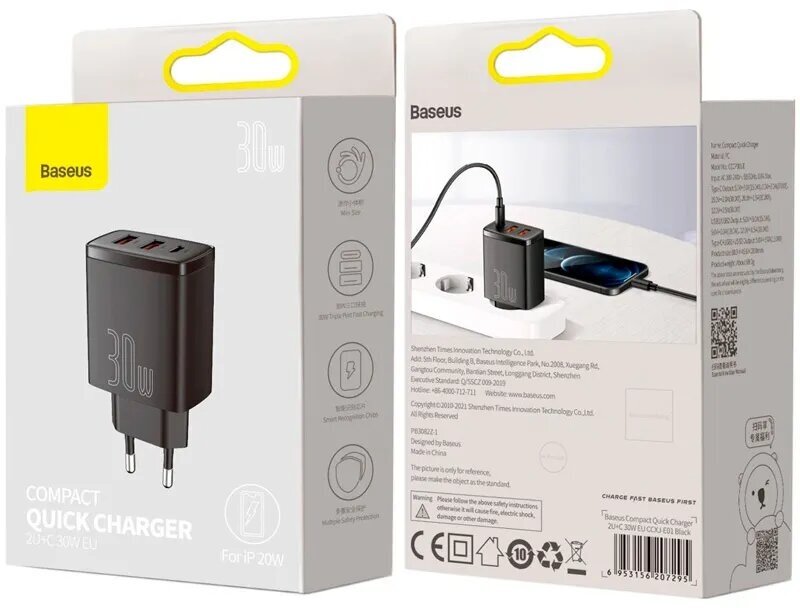 Зарядное устройство Baseus Compact Quick Charger 2xUSB USB Type-C 30W EU Black CCXJ-E01