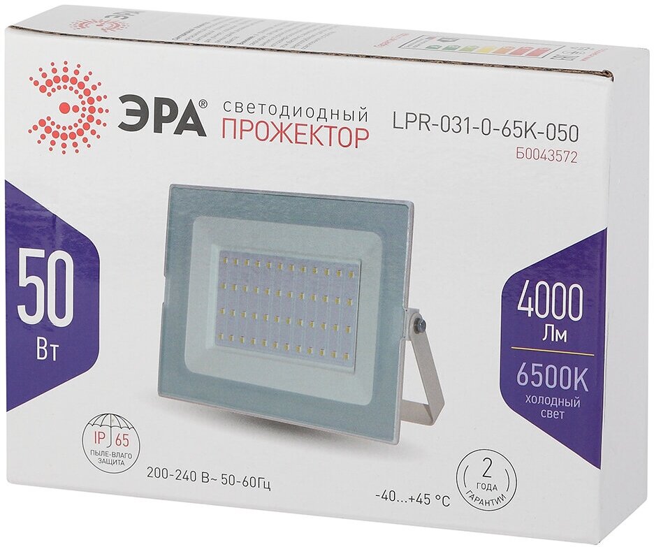 Прожектор светодиодный ЭРА Б0043572 LPR-031-0-65K-050 50Вт 4000Лм 6500К 183x131x36 белый корпус LPR- .