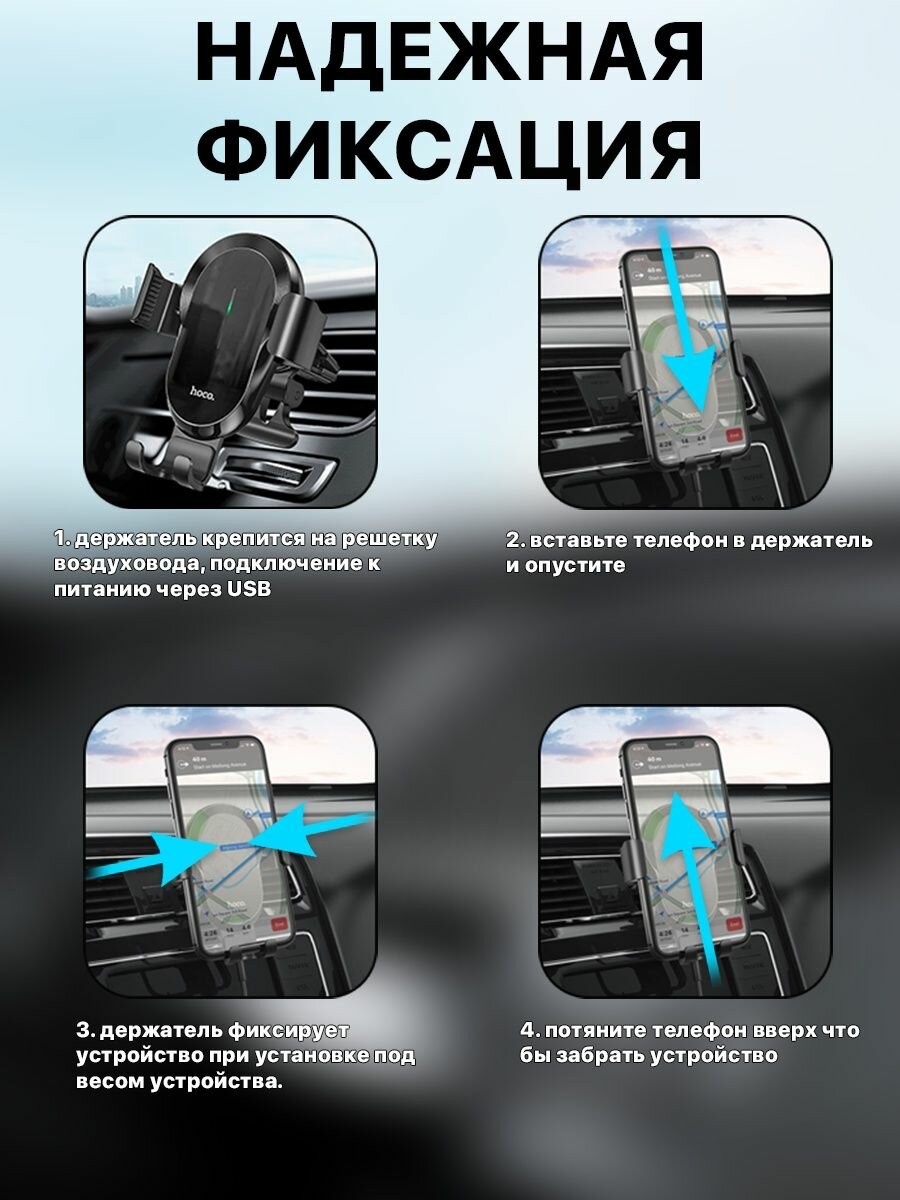 СохранитьДержатель автомобильный - Hoco CA105, зажим в дефлектор, с беспроводной зарядкой, черный, 1 шт. интересное: