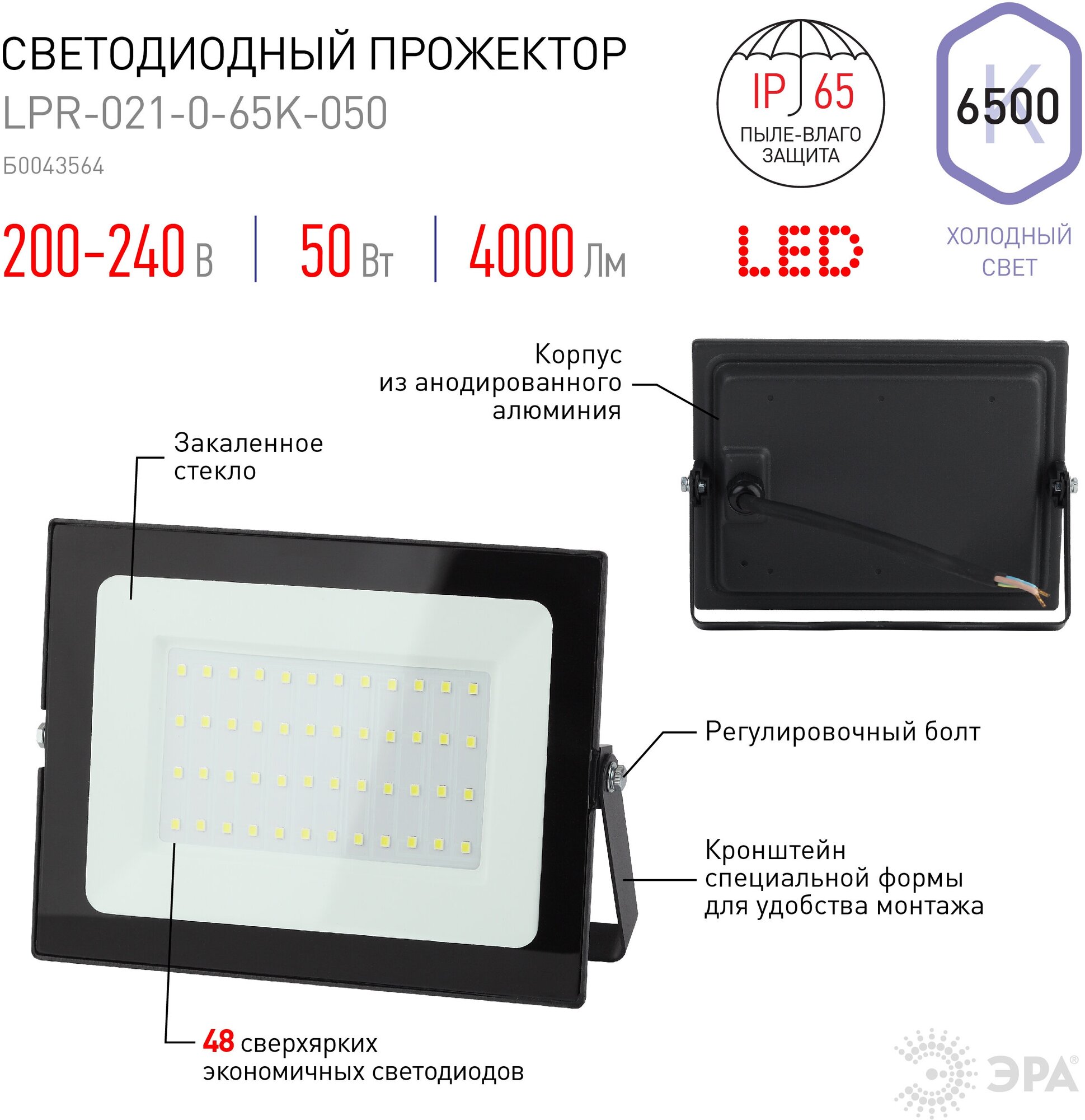 Прожектор светодиодный ЭРА, 50(415) Вт, 6500К, 4000 Лм, IP65, черный, LPR-023-0-65K-050, Б0052024