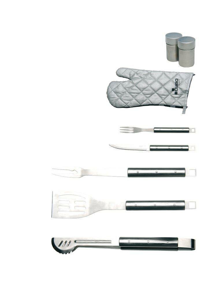 | Комплектация | - солонка и перечница 6 см; - вилка для стейка 24 см; - нож для стейка 25 см; - лопатка с отверстиями 43 см; - вилка для мяса 44 см; - щипцы; - рукавица; - фартук-чехол. |