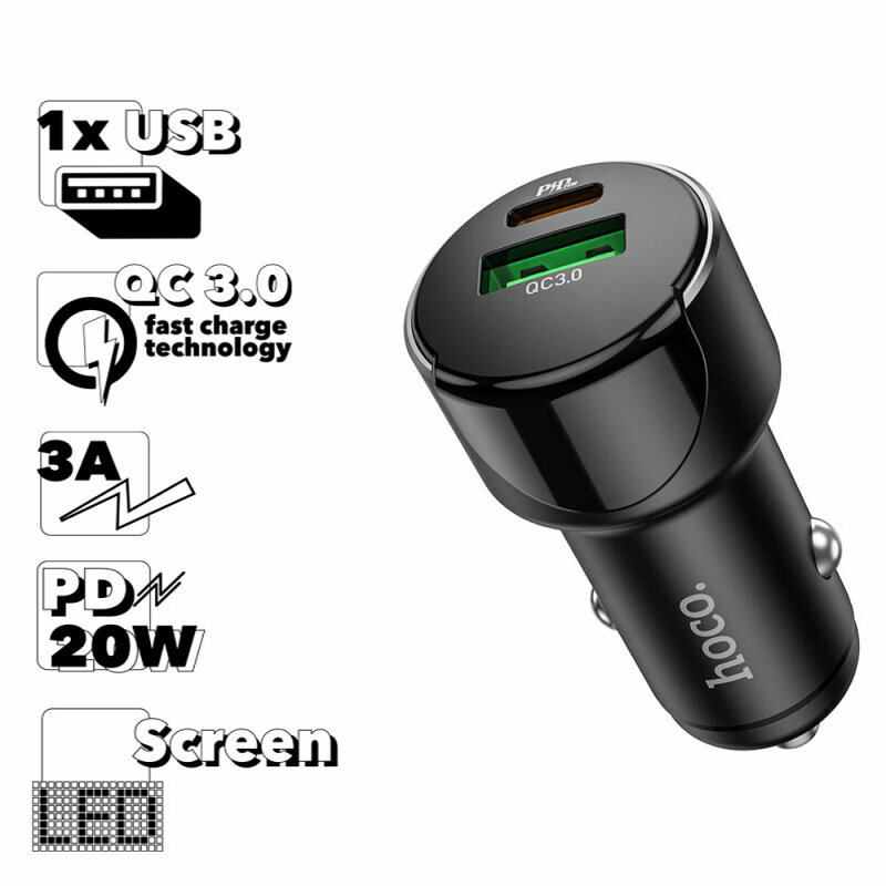 Автомобильная зарядка HOCO Z42 Light Road 1xUSB, 1xUSB-C, 3А, PD20W, QC3.0, LED дисплей (черная)