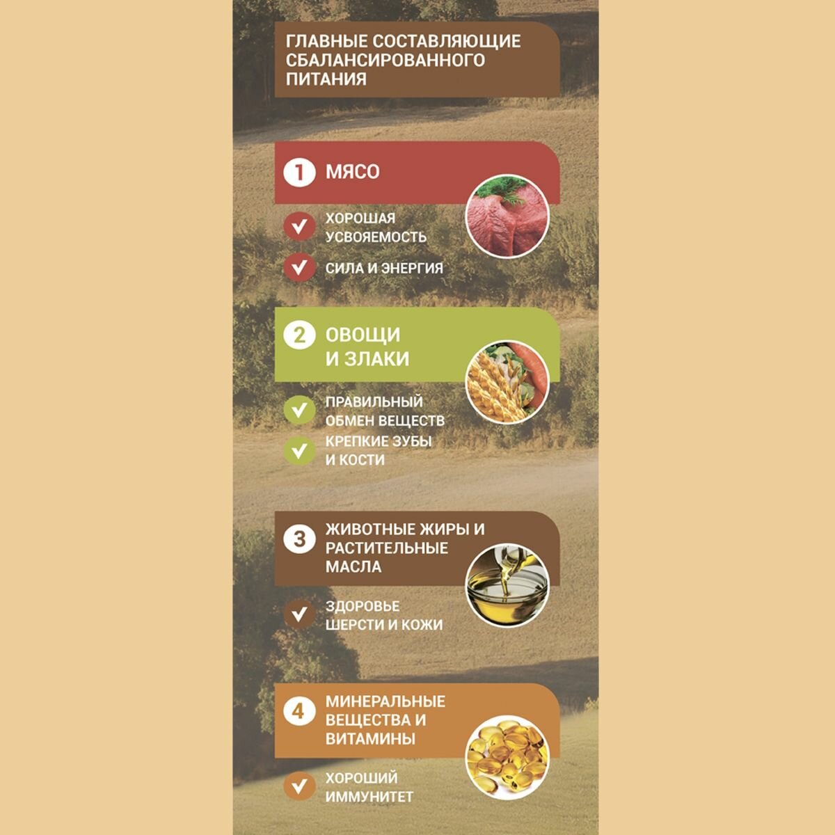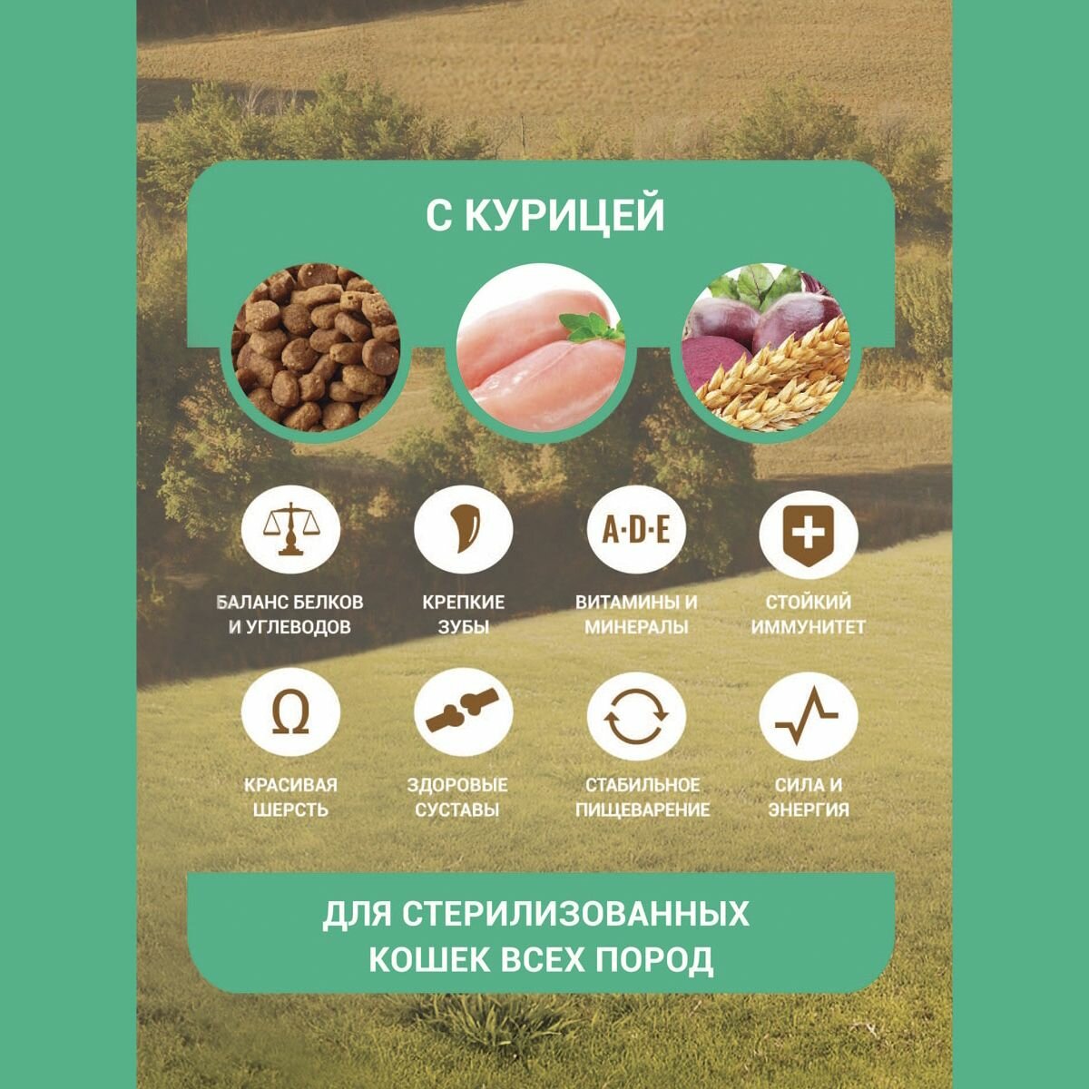 | Состав | Мясо и продукты животного происхождения (в том числе из курицы мин. 14 %), цельные зерна пшеницы, цельные зерна кукурузы, овощи, пшеничные отруби, кукурузный глютен, масла и жиры, пивные дрожжи, минеральные вещества и витамины, рыбий жир (источник Омега-3 и Омега-6 жирных кислот), амино-кислоты (лизин, таурин), подкислитель, L- карнитин, антиоксиданты, консервант |