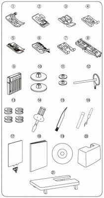 | Дополнительная информация | строчки для квилтинга; лапка для автоматической петли, лапка для потайного шва, прозрачная лапка для декоративных строчек, открытая лапка, лапка для отстрочки в край (0,6 см); в стандартную комплектацию входит расширительный столик, встроенная память - 1 банк, кнопка шитья двойной иглой, зеркальное отображение строчки, 10 строчек для прямого выбора; максимальная скорость шиться с кнопкой старт/стоп 700ст/мин |