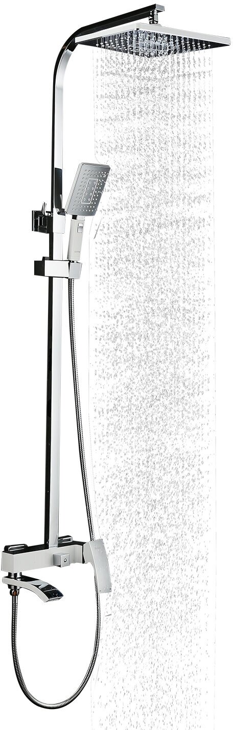 | Комплектация | Смеситель / душевая стойка / шланг / лейка / держатель лейки; верхний душ / эксцентрики / крепления |
